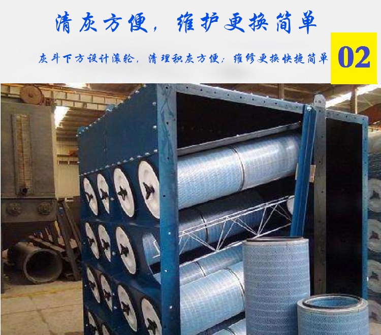 而較細粉塵均勻地進入中部箱體而吸附在濾筒的外表面上,干凈氣體透過濾筒進入上箱體,并經(jīng)各離線閥和排風(fēng)管